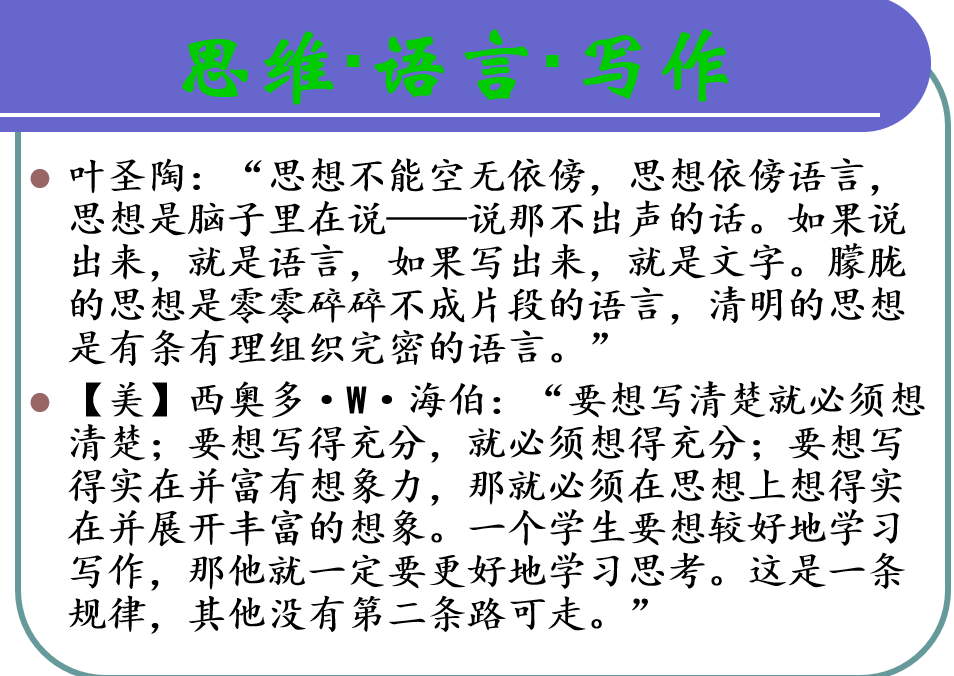 总之,作文的过程是为自己的思想意识寻求表达的过程,思维在这一过程中处于核心的地位。思维不仅决定着写作的内容(如新颖性、深刻性、丰富性),也决定着语言表达的形式(如层次性、准确性、生动性)。置身于丰富多彩、变化多端的自然与生活之中,只要善于调动思维,就会有不同的感受和见解,就会有充满个性的文章。