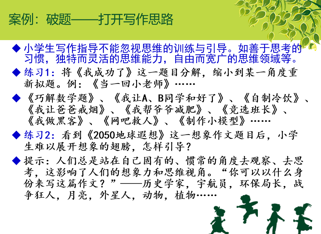 到了高年级,抽象概念思维开始成为思维的主要形式,即抽象概念思维进入敏感期,因此要通过思维训练培养学生归纳推理和演绎推理的技能。在写作活动中要侧重写实用性的命题作文和自由命题作文,如记叙文和少量的、简单的议论文、说明文训练等。