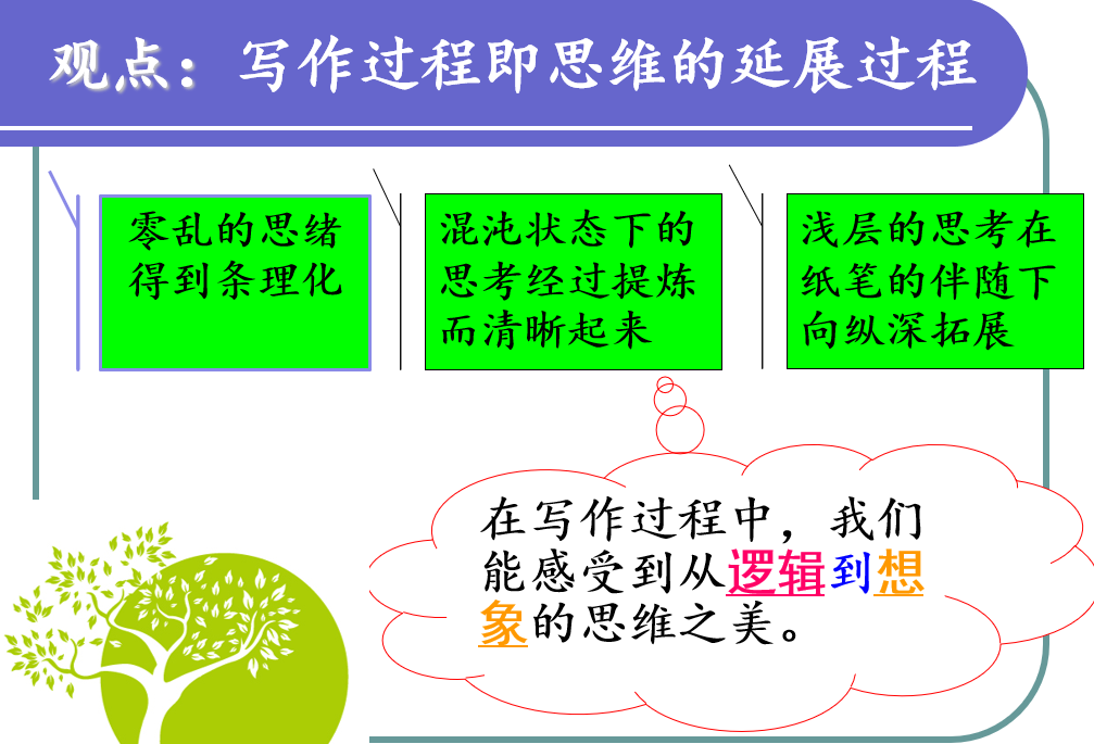 你看,写作过程其实就是思维的延展过程。文章的好坏,首先取决于我们的思维与情感,取决于我们的内心。在这一过程中,零乱的思绪得到条理化,混沌状态下的思考经过提炼而清晰,浅层的思考在纸笔的伴随下向纵深拓展,想象与联想如同舞动的翅膀,让我们的大脑飞翔,让我们的情感跃动。总之,在写作过程中,我们能感受到从逻辑到想象的思维之美。写作指导,表面上看是技术、方法的指导,但如果你真的只盯在技术和方法上,其结果很可能是失败的。