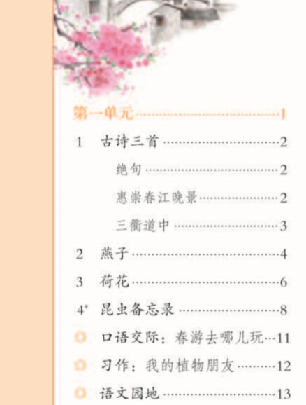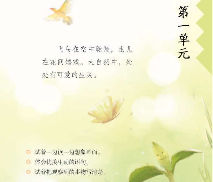 三年级下册第一单元以“可爱的生灵”为主题内容,编排了3首古诗和《燕子》《荷花》《昆虫备忘录》3篇课文。