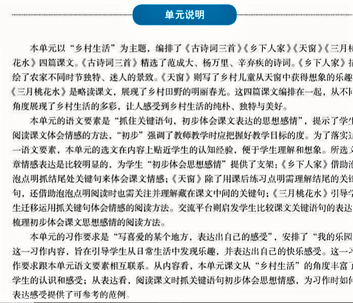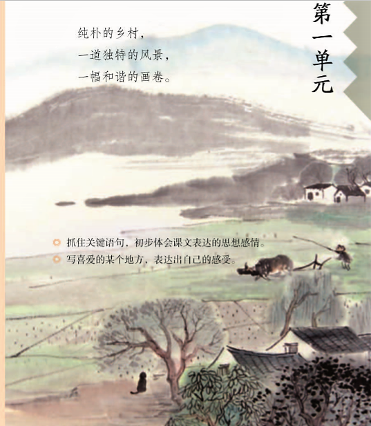 四年级下册第一单元以“乡村生活”为主题,编排了3首古诗和《乡下人家》《天窗》《三月桃花水》3篇课文。