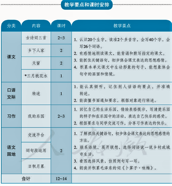 下面是教学参考书中对本单元教学内容的说明,以及本单元教学课时、教学要点的教学建议。