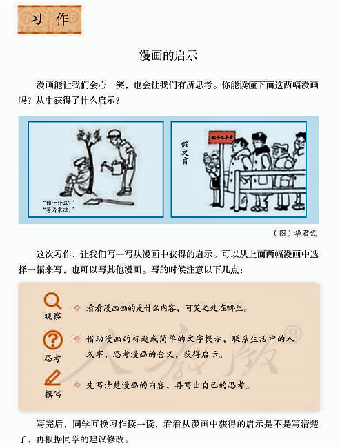 2.请你根据上面的习作要求和提示,从其他途径任意选择一幅漫画(不要选择上面本单元中出现的华君武先生的漫画),以“漫画的启示”为题写“下水文”,400字左右,以WORD文档形式;