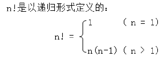 设计算n!的函数为fun(n),当n>1时,fun(n) = n * fun(n-1)。即在fun(n)函数体内将递归调用fun()自身。