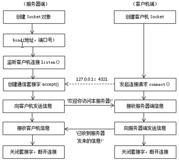(4)Socket对象用accept()函数等待并接收客户端的连接,连接成功则创建一个新的通信套接字。