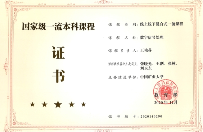 中国矿业大学《数字信号处理》课程, 2010年获江苏省精品课程,2019年获江苏省在线开放课程建设立项,2020年获首批国家级线上线下混合式一流本科课程,2021年获首批江苏省线上一流本科课程。配套自编教材《数字信号处理原理及实现(第3版)》为江苏省高等学校重点教材,2020年获江苏省优秀教材培育。