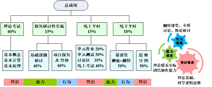 基础科学思维”、“能力-实际动手团结协作能力”、“行为-翻转讨论探究答辩等表现”等