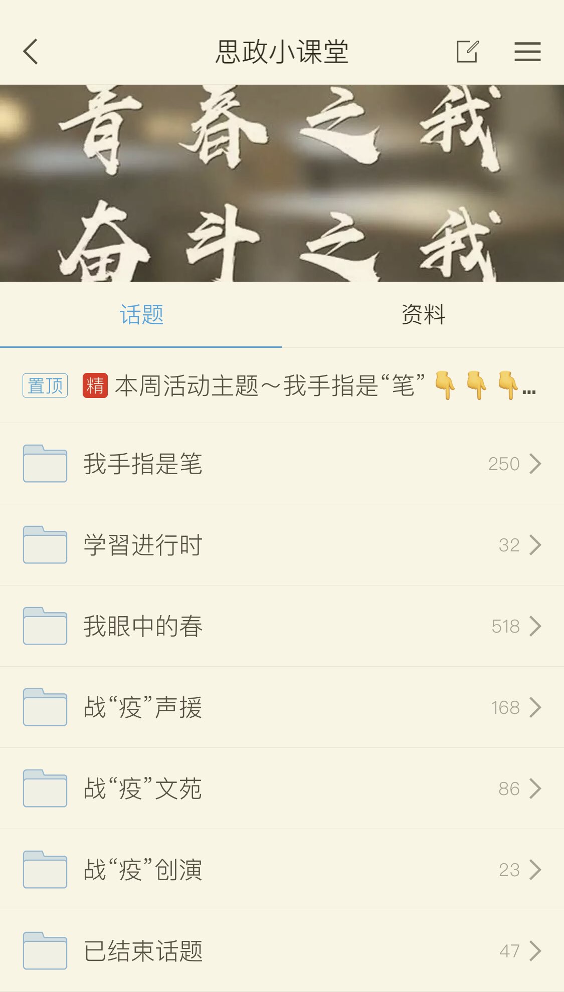 2.写战“疫”故事,以“我眼中的战疫”为主题,每班至少选一篇上交,积极动员班级写作能力强,愿意写的同学完成,凡是被采纳的稿件,均参加学期末评奖;并给与加分,题目自定,字数在1500字左右,学委收好后,提交形式“思政小课堂”→战疫文苑→战疫故事栏目(务必原创),优秀的文章推选参加我省战“疫”主题征文。