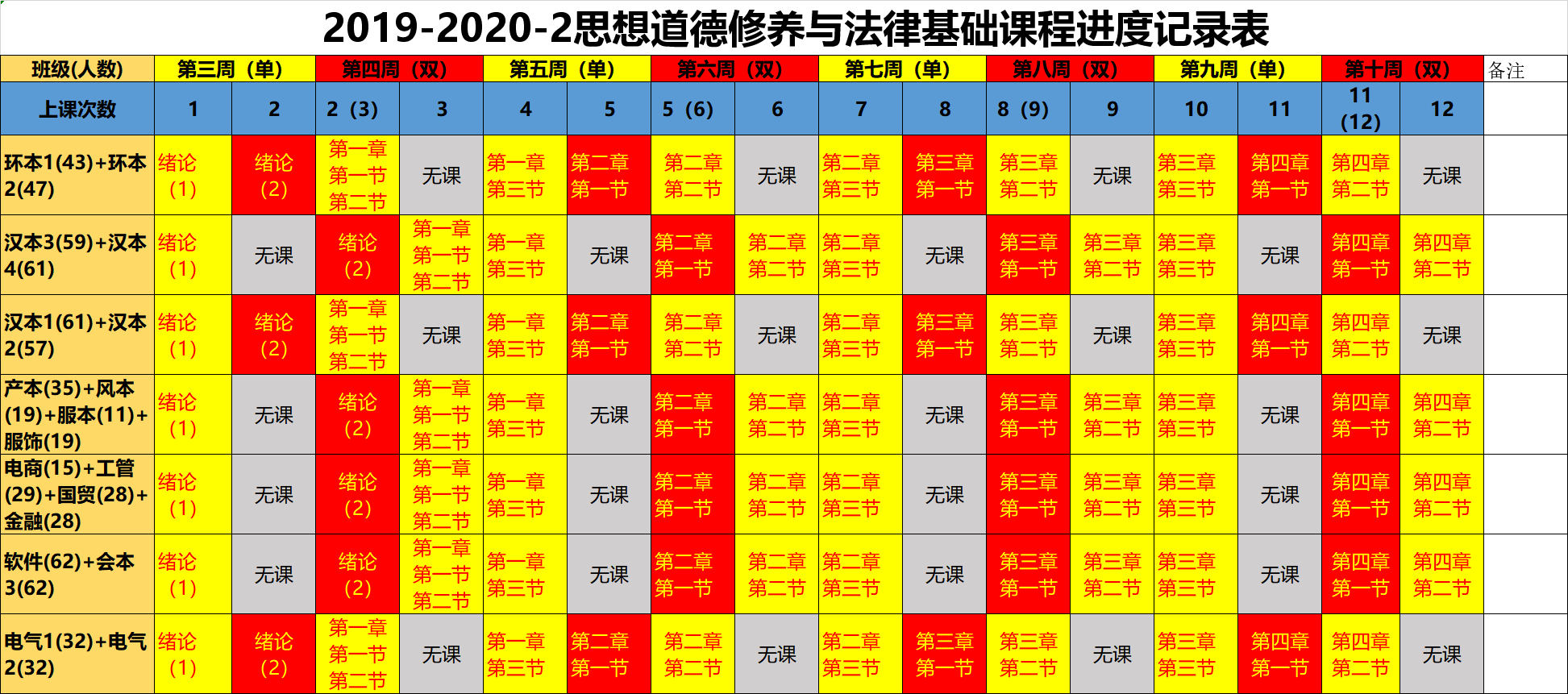| 课程介绍;约10分钟 | “思想道德修养与法律基础”课程介绍 | 学习目的、意义;学习方法;学习效果等 | 袁超 | 10 | 课程介绍 | 2学时 |