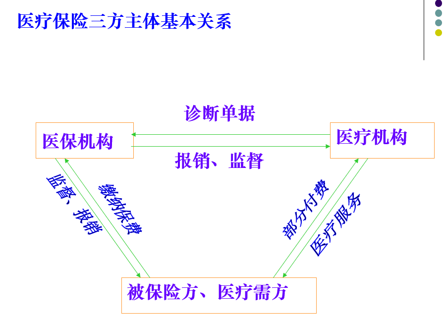 一般的保险项目只涉及保险人、被保险人两方主体 。医疗保险中共涉及三方主体:被保险人、医疗保险的提供方(保险人)、医疗服务的提供方。
