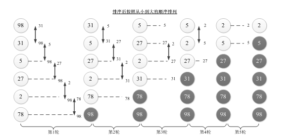 实现原理:在冒泡排序的过程中,按照要求从小到大排序或从大到小排序,不断比较数组中相邻两个元素的值,较小或较大的元素前移。
