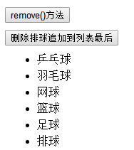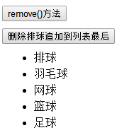 <input type="button" id="btn4" value="删除排球追加到列表最后"><br>