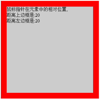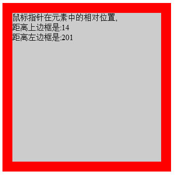 $(this).html("鼠标指针在元素中的相对位置,<br>距离上边框是:"+t+"<br>距离左边框是:"+l);