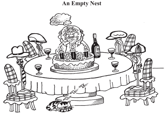 The picture describes an empty nest. The old man’s children and grandchildren are all distant from him. Maybe some are too busy to come to the party. Maybe others live too far away to come. What can be done?