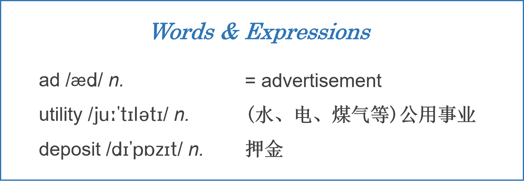A. Pretend you are a businessman who is looking for an apartment. Read the following advertisement for information.