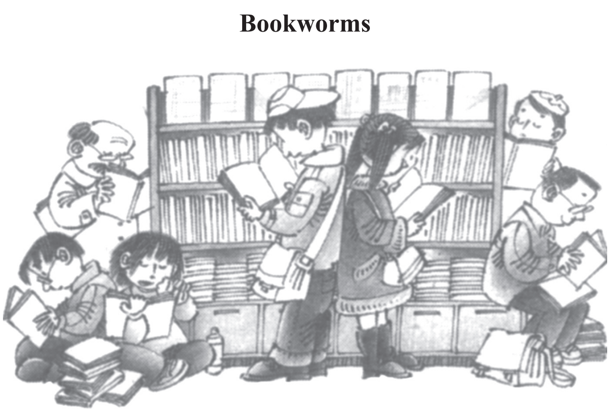 Look at all those bookworms in the bookstore! They are old and young, boys and girls, men and women. Some are reading over by the bookshelf. Some are standing with a book in their hands. Others are down on the floor completely wrapped up in their reading. There are so many books sitting on the shelves just waiting to be read! People can reach out and pick up any book they want. What a feast!