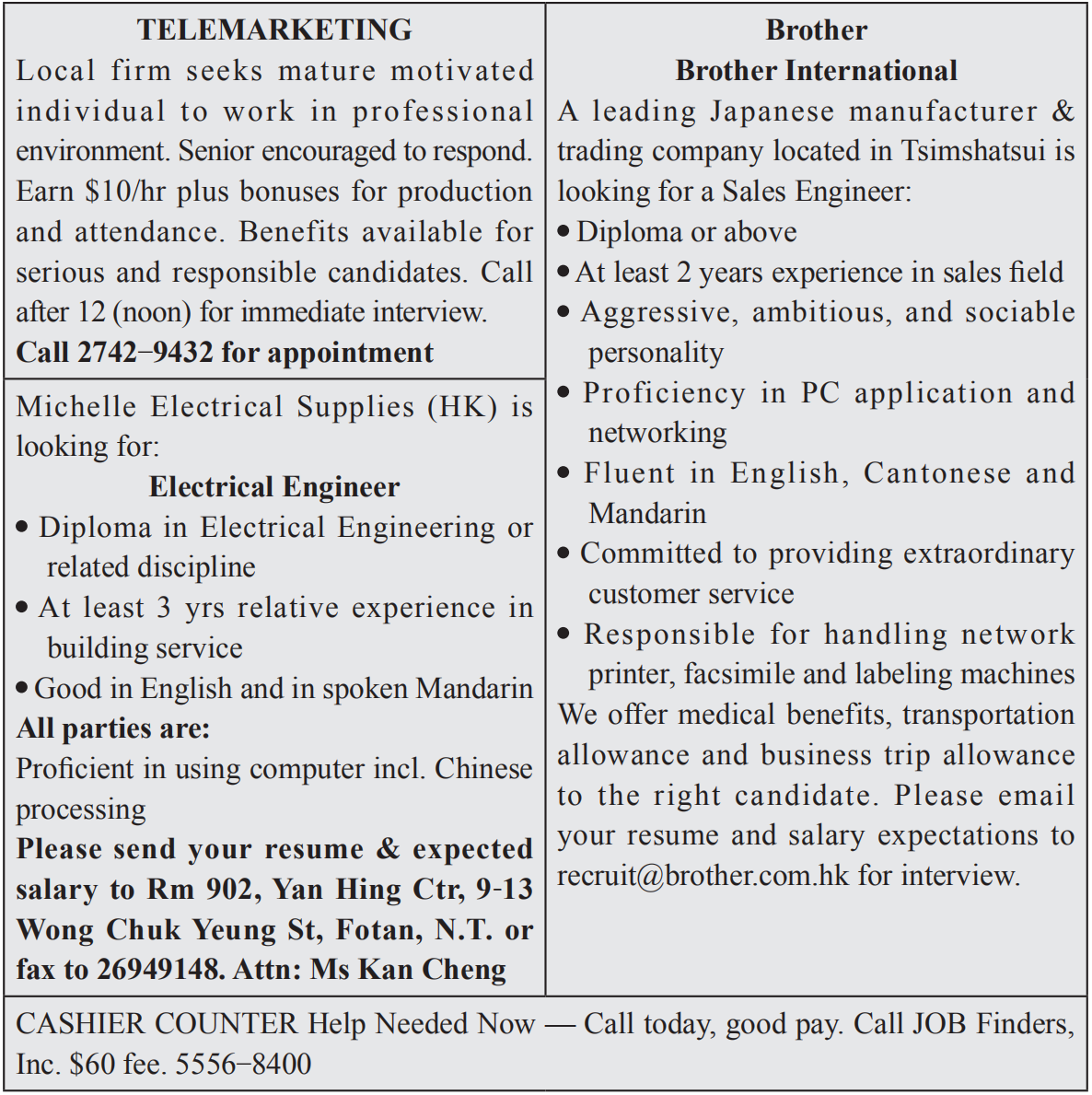 Send the résumé to Room 902, Yan Hing Center, 9 — 13 Wong Chuck Yeung St, Fotan, N.T. or fax to 26949148.