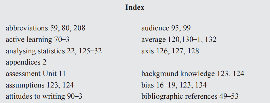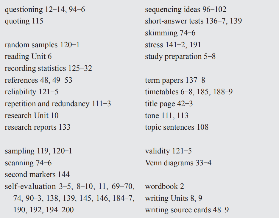 索引 (index) 不同于目录,它出现在书的最后。它不以内容出现的先后顺序排列,而是按照字母顺序排列。索引有主题索引、人名索引,也有主题和人名在一起的索引。索引告诉我们某一内容、 某一主题、 某一人物等出现在书中的哪一页或哪几页上,我们甚至能在索引中了解到哪几页上讨论某一内容比较详细。如果说目录告诉我们某一章节主要涉及什么内容,那么索引则告诉我们在书的那些地方出现过与某一主题、某一人物等有关的内容。利用索引能帮助我们在最短的时间里找到我们所需要的信息。