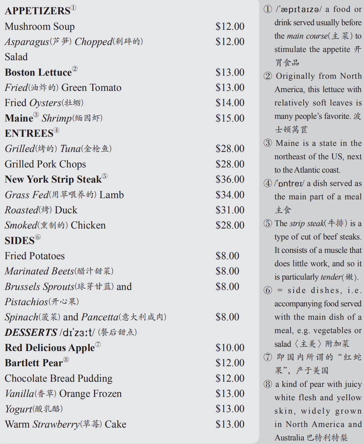 ● The following is a menu that people can see in an American restaurant. After reading it, you are required to complete the statements that follow the questions.