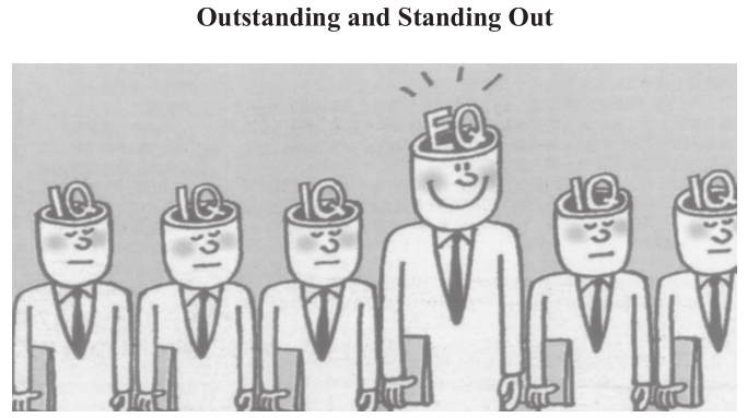 It shows a person with a high EQ standing higher than all the rest of the high IQ people. As the only person with a high EQ, he stands out and seems like a winner. The picture is trying to tell us that EQ factors weigh more in success than IQ factors do. In short, the illustration conveys the clear message that EQ is more important than IQ.
