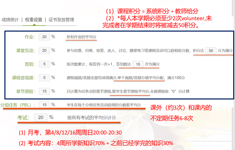 平时成绩按百分制给分,共包含7个评价小项,分值分配如下图:
