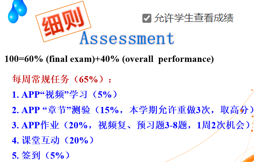 课程总成绩= 40% 平时成绩+ 60%期末考试(闭卷)