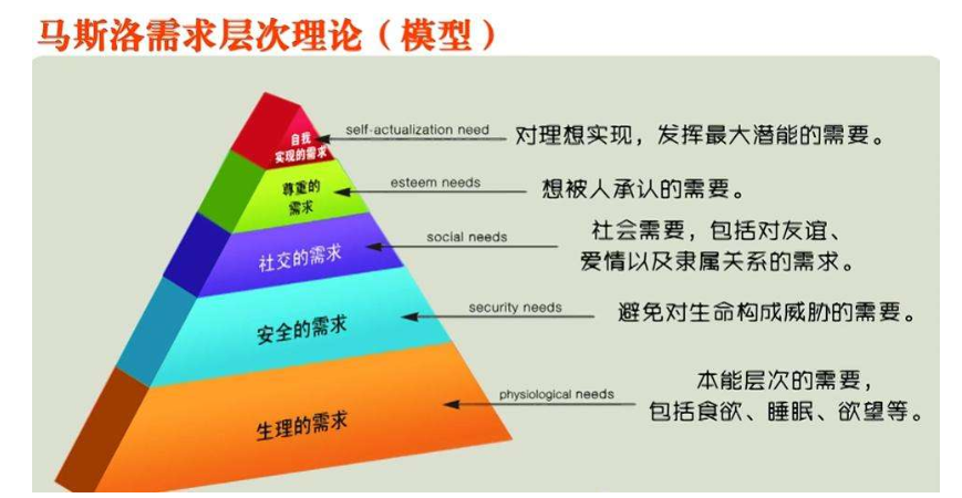 1943年,心理学家马斯洛提出了一个需要层次理论,他认为,人类的需求是有层次的,从低级需要到高级需要分别是生理需要、安全需要、社交需要(归属感需要)、尊重需要和自我实现需要。他还认为,人类的一些先天需要,也就是低级的需要和动物的类似,但越高级的需要越是人类特有的。当一个人的低级需要得到满足后,才会出现高级需要。