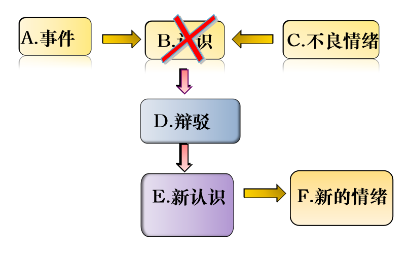 为了更好地调控情绪,埃利斯提出ABCDEF的认知改变技术,即,改变我们不合理的认识可以调控情绪。