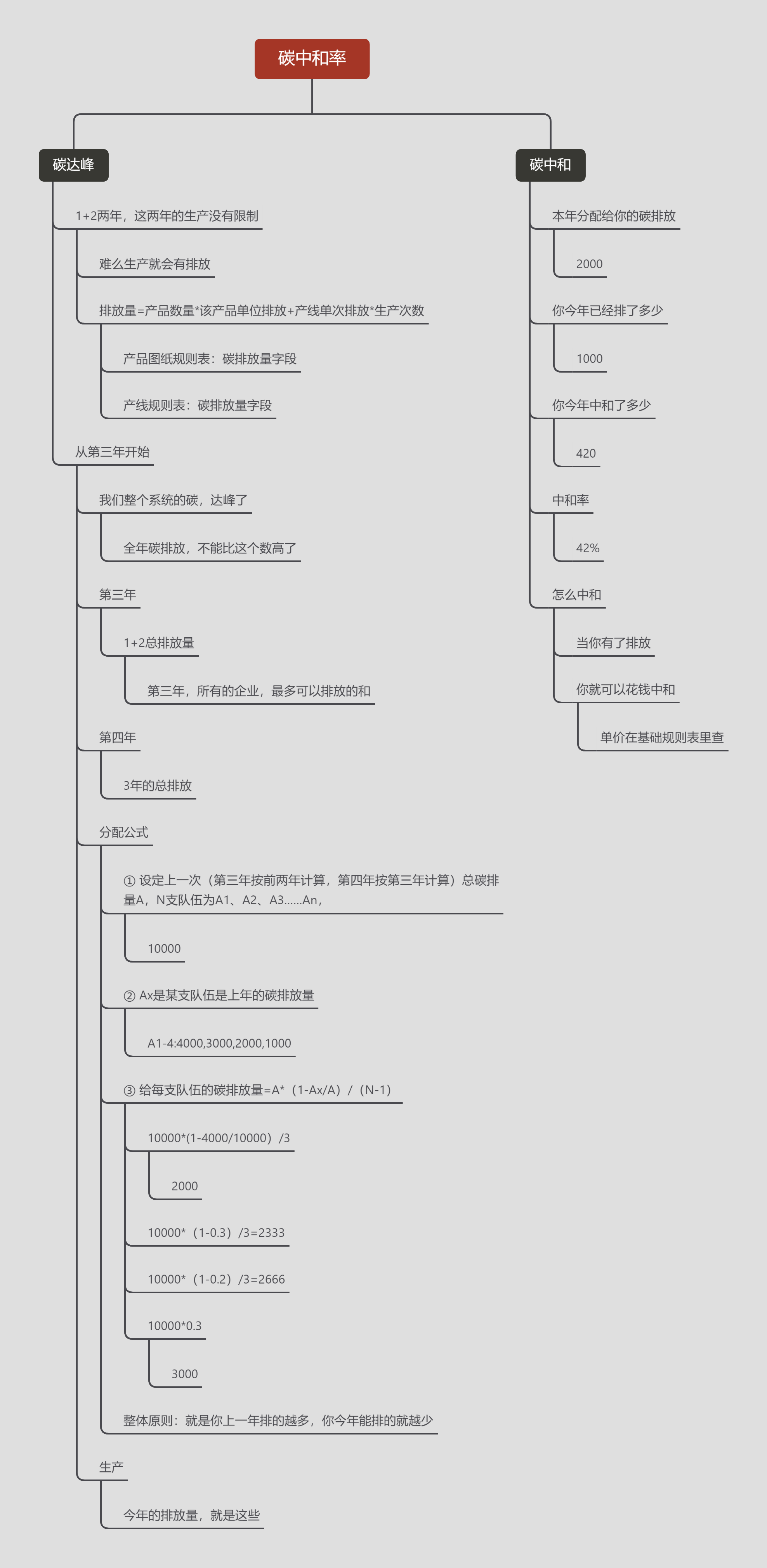 4.分配算法:碳排放越少的,次年分配的碳排放量越高;公式为:1设定上一次(第三年按前两年计算,第四年按第三年计算)总碳排量A,N支队伍为A1、A2、A3......An,2Ax是某支队伍是上年的碳排放量3给每支队伍的碳排放量=A*(1-Ax/A)/(N-1)4需注意的是,开放双碳时,一定要保证多组经营。仅单组经营时,无法被分配到排放量。
