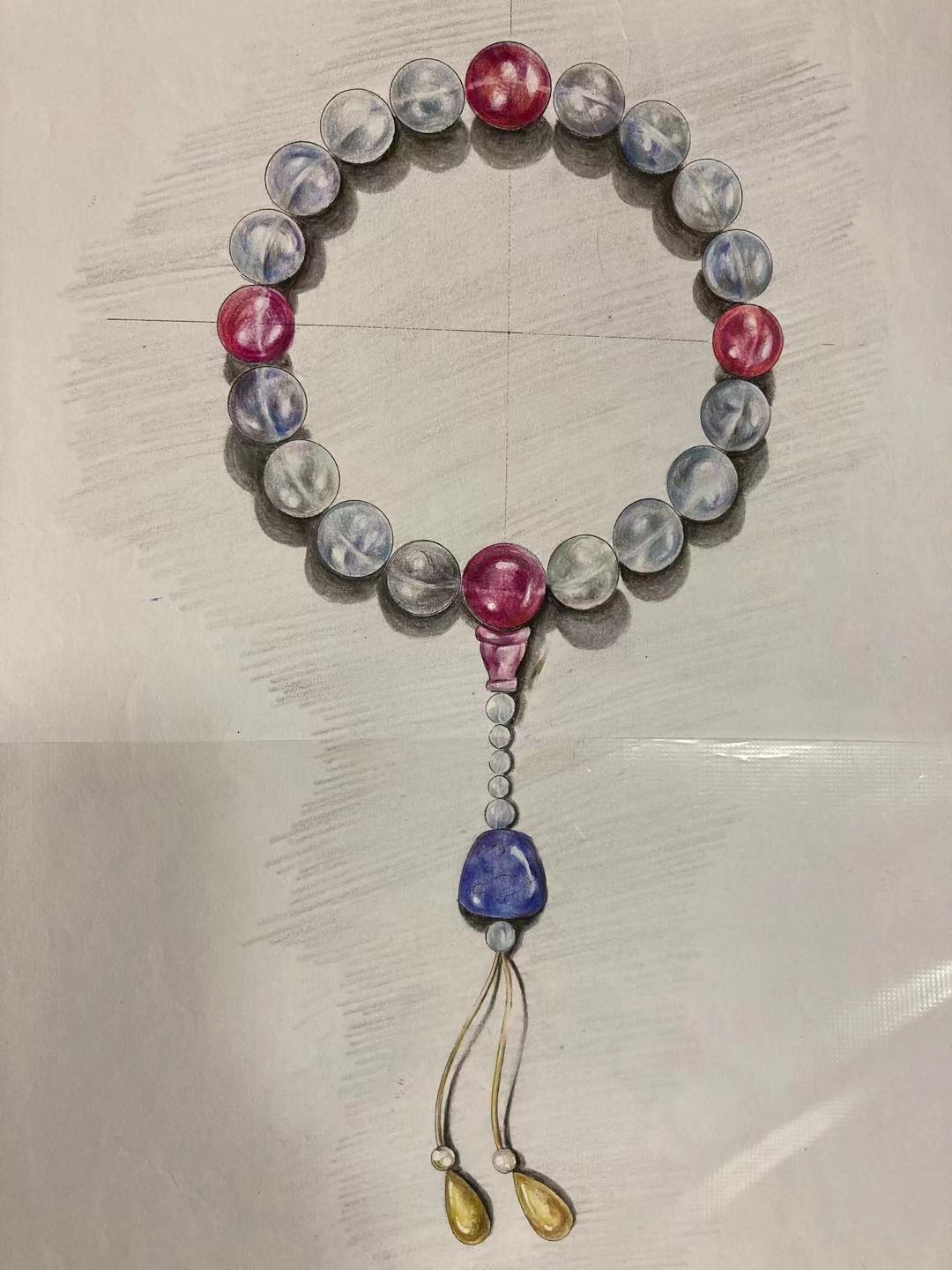 镶嵌珠类首饰画法要点:珠子孔洞的线形在画的时候需要有变化,注意反光的处理。
