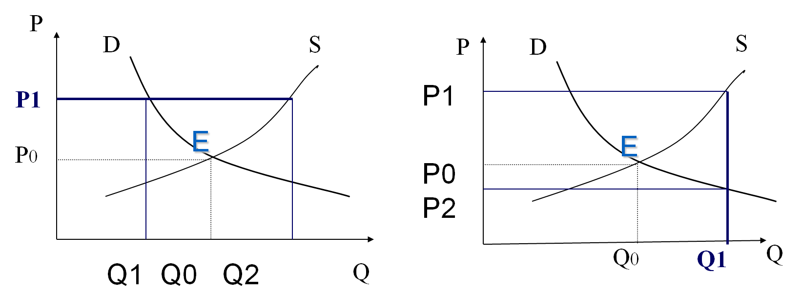 市场价格>均衡价格:供大于求,商品过剩或超额供给。在市场自发调节下,需求者压低价格,供给者减少供给量。