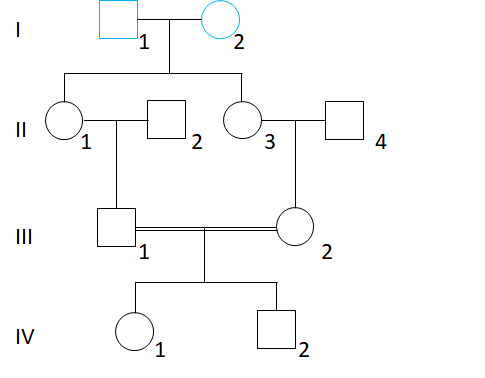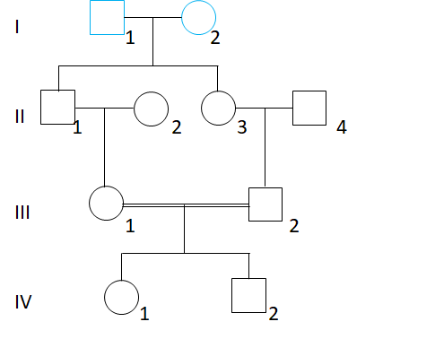 I1个体有两个等位基因,他对近婚系数的贡献就是2×(1/2)6,同I2个体的贡献也一样。因此IV1的近婚系数为: