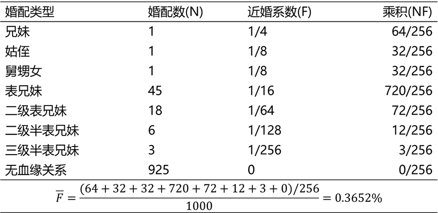 例题:在一次群体调查中发现,在1000例婚配,中兄妹婚配1例,姑侄婚配1例,舅甥女婚配1例,表兄妹婚配45例,二级表兄妹婚配18例,二级半表兄妹婚配6例,三级表兄妹户内3例,其余为非近亲婚配。这个群体的平均近婚系数是多少?