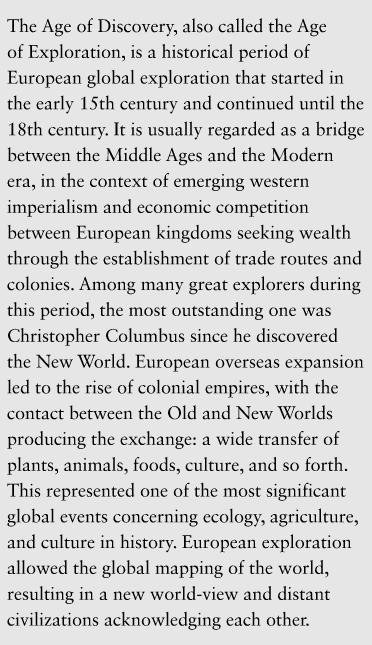大发现年代,也被称为大勘探年代,是欧洲进行全球勘查的一个历史时期,始于15世纪初并一直持续到18世纪。 这一时期通常被认为是中世纪和近代之间的桥梁, 当时西方帝国主义刚兴起,欧洲各王国之间正在经济上互相竞争,他们想通过建立贸易路线和殖民地来寻找财富。 在这一时期众多伟大的探险家中,最杰出的是克里斯托弗•哥伦布,因为他发现了新大陆。欧洲的海外扩张导致了殖民帝国的崛起,旧大陆与新大陆的接触也促进了两边的互相交换:大量的植物、动物、食物、文化等得到迁移。这代表了历史上生态、农业和文化在全球范围内最重大的活动之一。欧洲大勘探让绘制全球性的世界地图成为可能,从而使人们看到一个新的世界与古老的文明正遥相呼应。