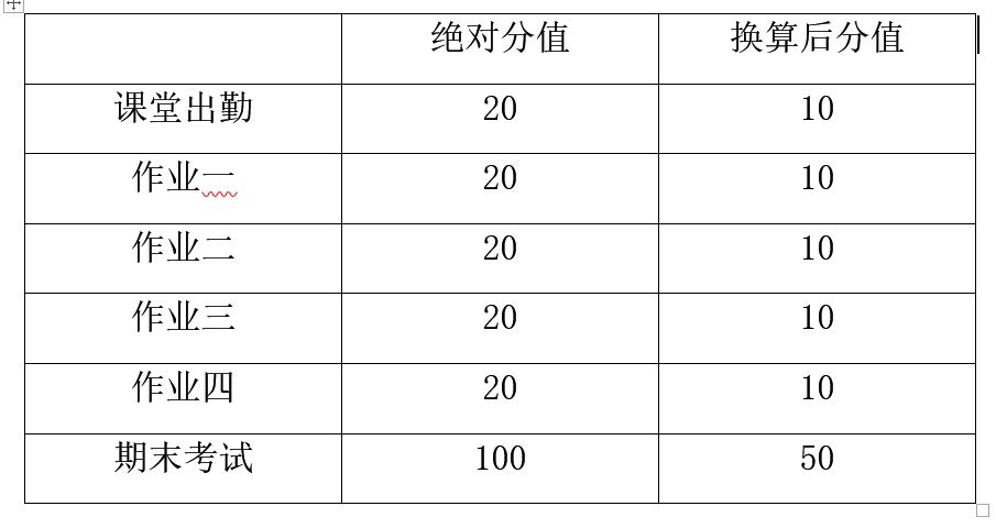 课程成绩:百分制,平时50%(出勤,课堂表现,课后作业)+期末考试50%