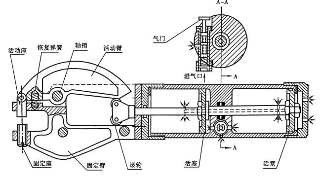 拉式气动手提压铆机的构造如图所示。它主要由活塞、气缸、气门、活动臂、固定臂、活动座、固定座、滚轮等组成。