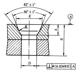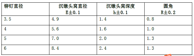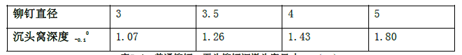 1)冠头铆钉的沉头窝角度应与铆钉头角度一致。沉头窝的深度应与钉头的高度一致,允许浅0.1mm,其形状和尺寸如图和表所示。