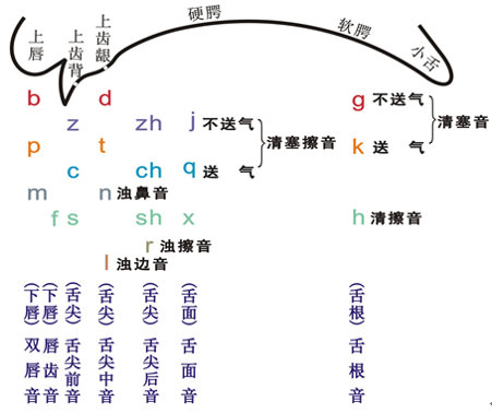 辅音的主要特点,是发音时气流在口腔或咽头要分别受到各种阻碍,因此可以说,声母发音的过程也就是气流受阻和克服阻碍的过程。声母的分类就是依据气流受阻的位置(发音部位)和克服阻碍气流的方式(发音方法)这两大因素。