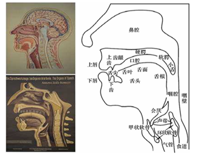 口腔和鼻腔是声音的“共鸣腔”。口腔的上部是上腭,包括上唇、上齿、上齿龈、硬腭和小舌;下部是下腭,包括下唇、下齿、舌头(分舌尖、舌面和舌根)。口腔的形态是可变的。口腔中各个器官能协同动作,使气流通过时形成各种不同形态的通道和不同情况的阻碍而发生振颤。语音的各种因素也就是在这里形成的。软腭和小舌把鼻腔和口腔隔开。当软腭和小舌上升时,鼻腔就闭塞了,声音就在口腔中产生共鸣,叫做口音;当软腭和小舌下垂,就阻塞了口腔,气流只能在鼻腔中产生共鸣,叫做鼻音;如果口腔内没有障碍,气流就从鼻腔和口腔中同时呼出,这时发出的音既有鼻腔共鸣又有口腔共鸣的成分,我们把它称之为鼻化。