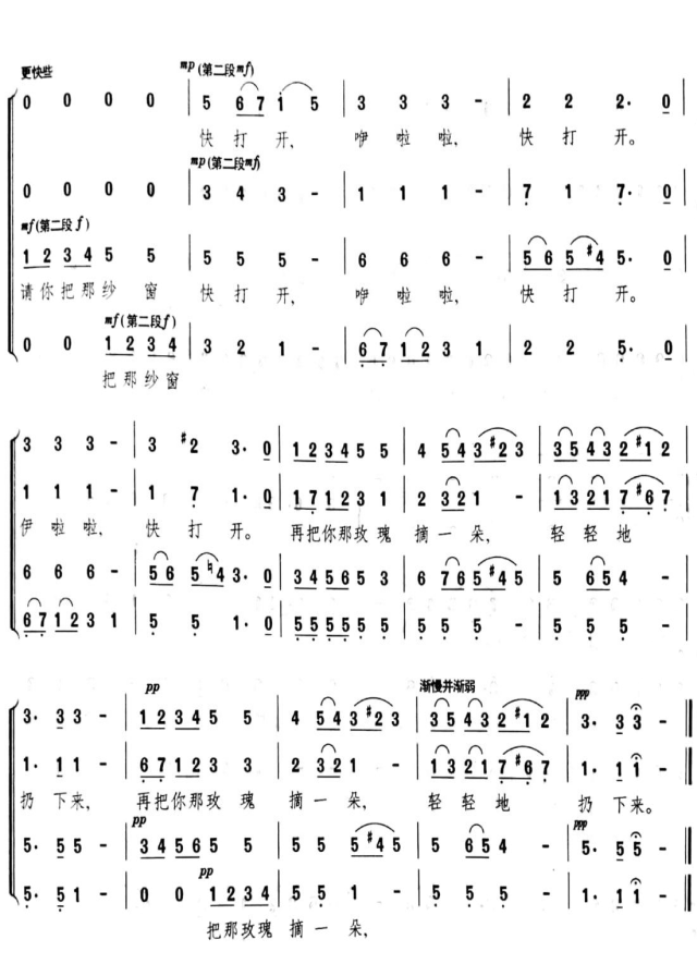 2.第一部分顿音得作用;第二部分各声部主旋律得提示及渐慢得手的提示;第三部分sfp的运用。
