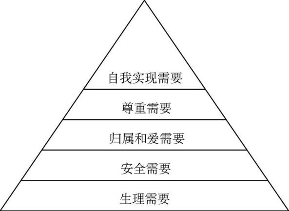 需要层次论是由人本主义心理学的代表、美国心理学家马斯洛提出的。他认为,人的一切行为都是由需要引起的,而需要又是分层次的。他把人的需要分为自下而上的五个层次。它们由低到高依次排列成一定的层次,即生理的需要、安全的需要、归属和爱的需要、尊重的需要、自我实现的需要(图6-1)。马斯洛认为,五个层次之间是由低到高依次出现的。只有当较低一级的需要得到基本满足之后,高一层次的需要才会产生。