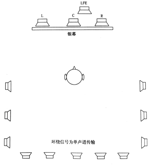 注:除了左声道、右声道以及中置声道这三个以外,后方的所有音箱播放的都是相同的环绕声道(S)信号,用于增加临场感。LFE为可选信号。