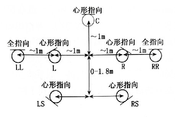话筒基本摆放为五点阵列,利用时间差和声强差共同还原一个环绕声场。
