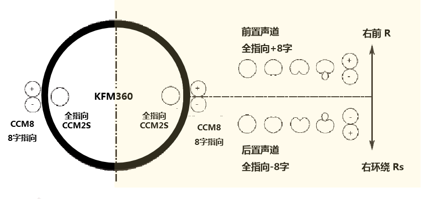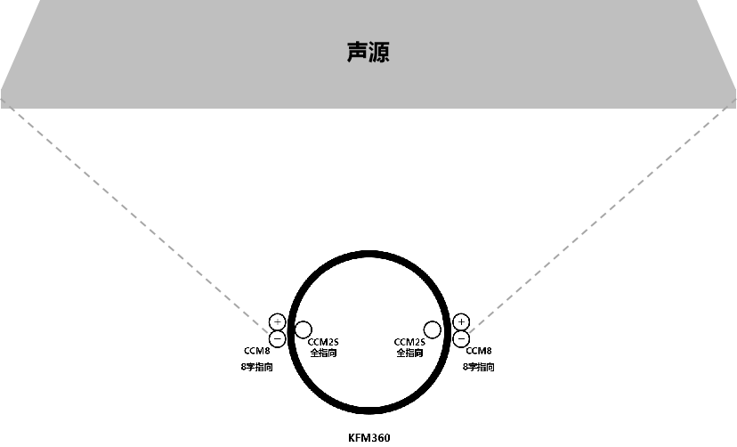 录音时,2只8字型话筒的0°轴指向声场前方拾取直达声,180°轴指向后方,拾取环绕声信号。KFM360与这两只话筒配合,可以得出四个声道的环绕声立体信号。