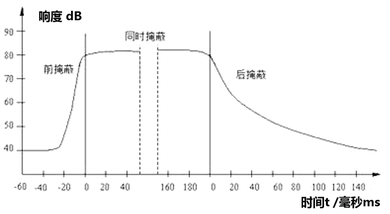 (3)除了相近频率的掩蔽效应以外,时域掩蔽的效果也会造成一定的数据冗余。(或者说可以帮助我们减少记录的数据量)