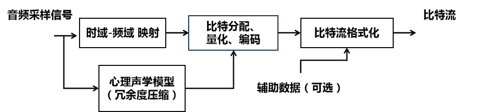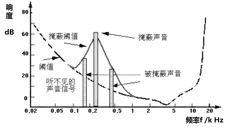 利用人的听觉特性,如掩蔽效应(时域 和 频域掩蔽)特性,将压缩编码带来的失真控制在人耳的听觉阈值以下,使人耳觉察不到失真的存在。