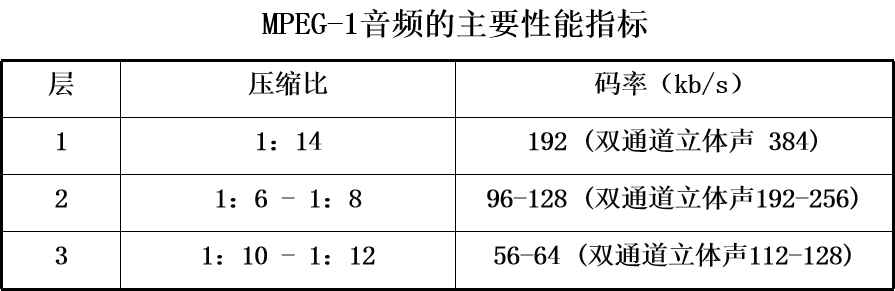 MPEG-1音频分三层,分别为MPEG-1 Layer1,MPEG-Layer2 以及 MPEG-Layer3,并且高层兼容低层。其中第三层被称为MPEG-1 Layer 3,简称MP3。
