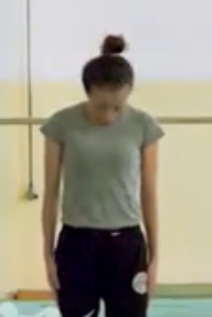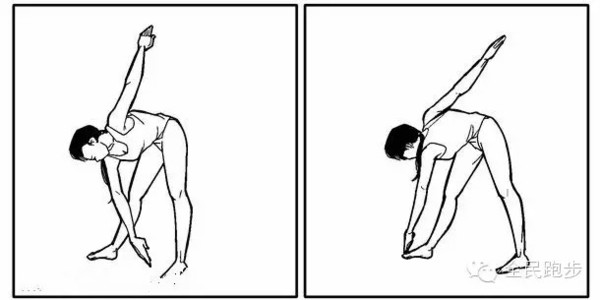 两脚开立,然后身体前屈用两手交替尽力够另一侧脚。