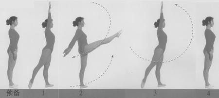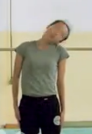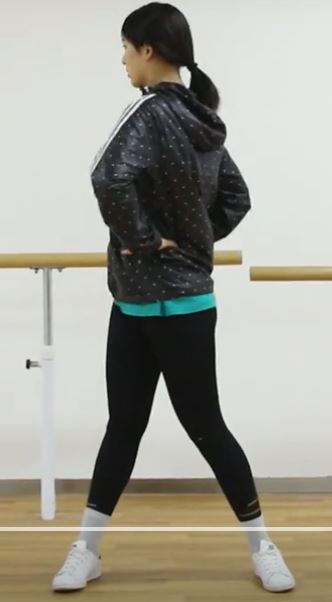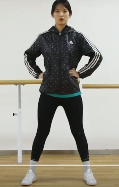 两腿稍开立,双手叉腰,1-2拍向左侧做转身运动,3-4拍向右侧做转身运动。