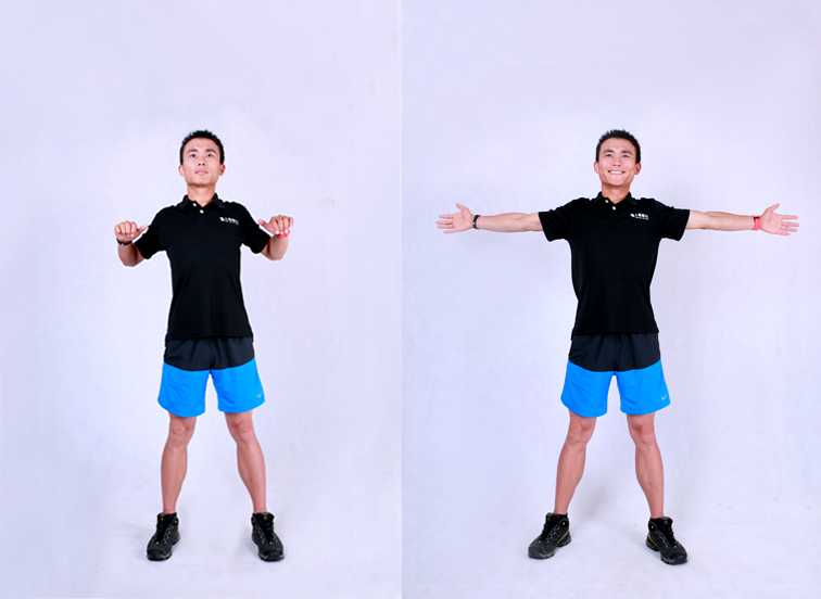 3—4拍:两臂侧平举(掌心向下)扩胸2次。